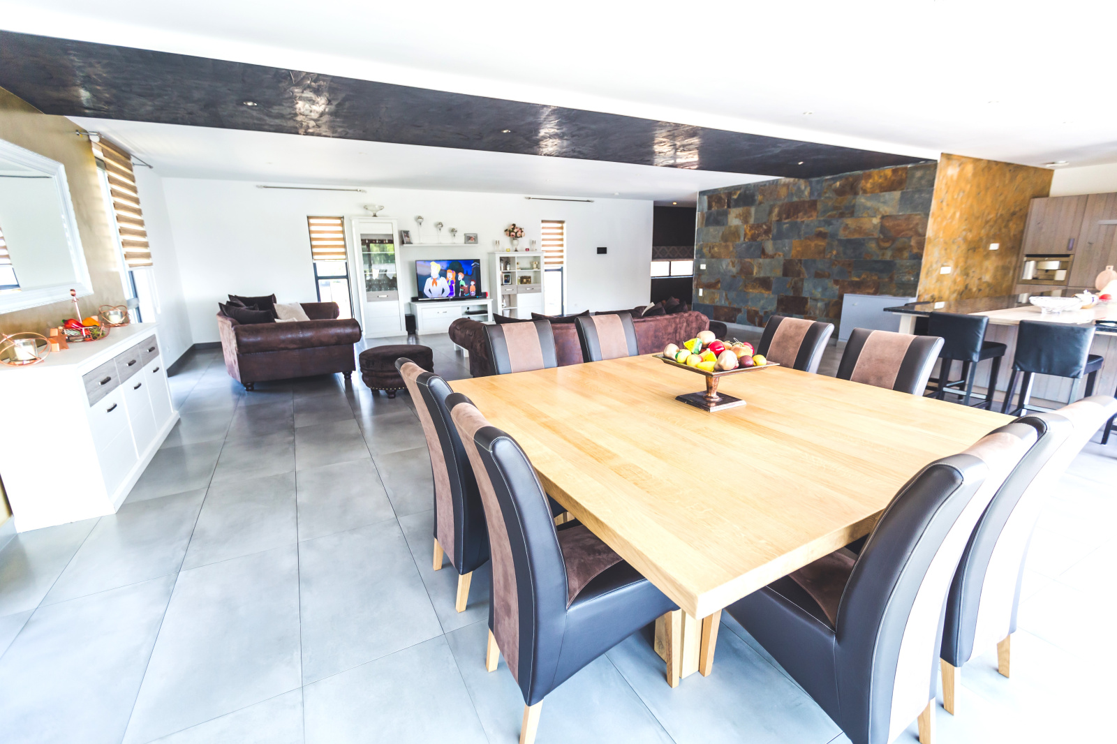 A l'étage, le logement est composé d'un dégagement, d'un vaste salon-séjour ouvert sur une cuisine entièrement équipée, d'un cellier, d'une chambre, d'une chambre parentale avec dressing et salle d'eau, d'une troisisème chambre avec salle d'eau, ainsi qu'une quatrième chambre avec salle d'eau.Ce bien possède une très grande terrasse orientée Sud et offrant une vue dégagée sur la forêt.