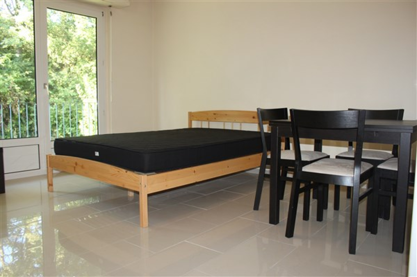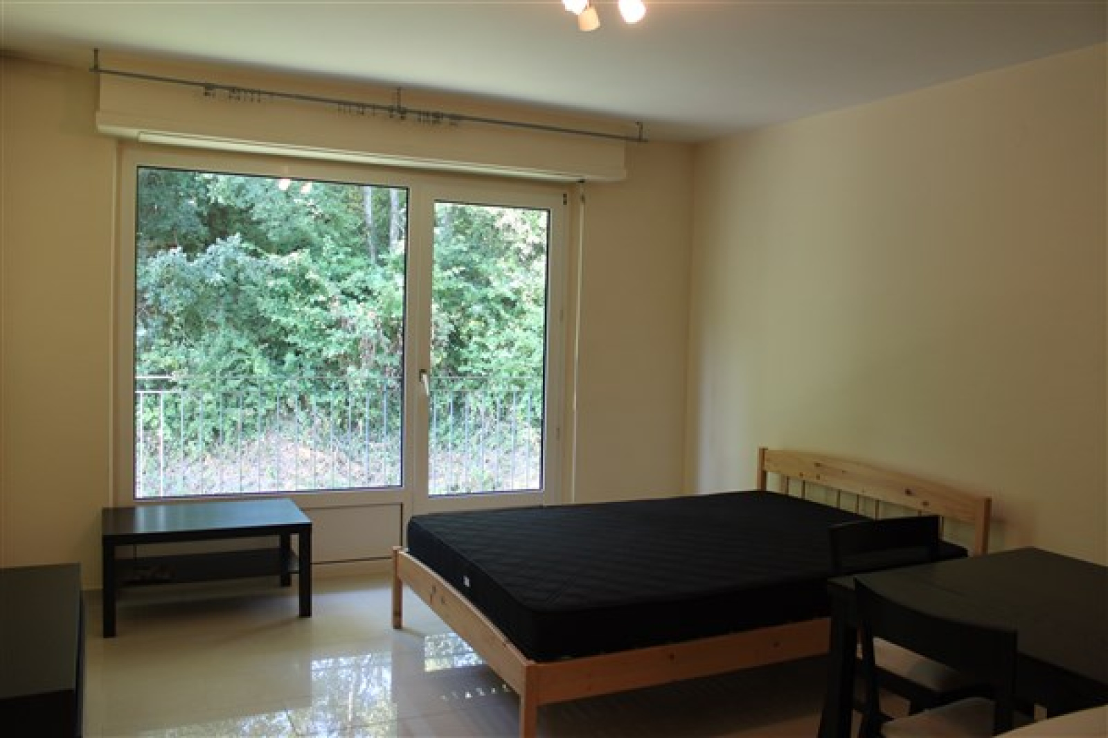 une pièce principale avec un lit double, une table avec 4 chaises, un meuble TV, une table basse, une kitchenette moderne donnant accès à un balcon avec vue sur la nature.