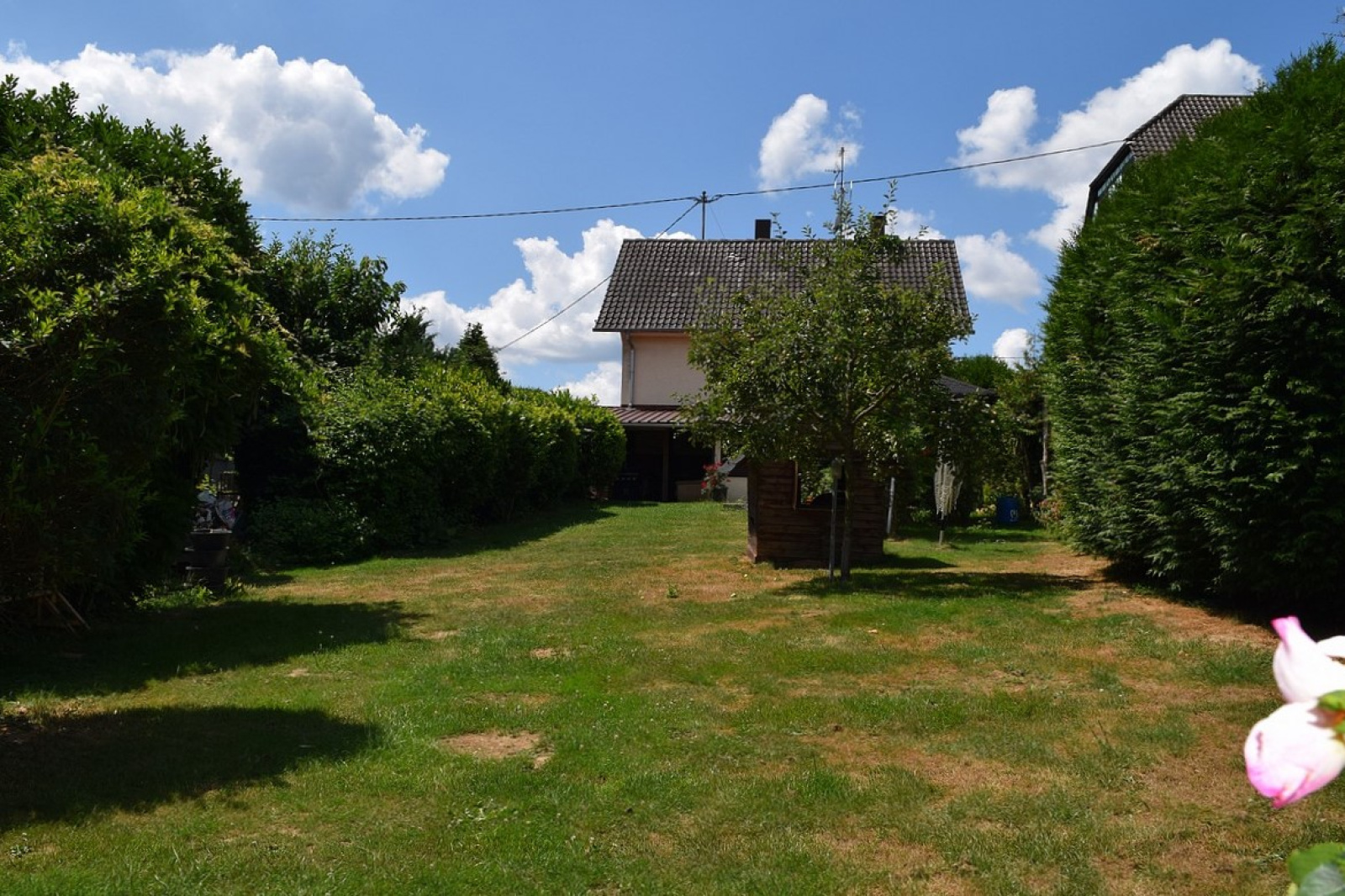 Construite sur une magnifique parcelle de 21,60 ares qui permet d’y édifier une seconde construction sans vis-à-vis, la maison d’env. 100m2 se compose comme suit :