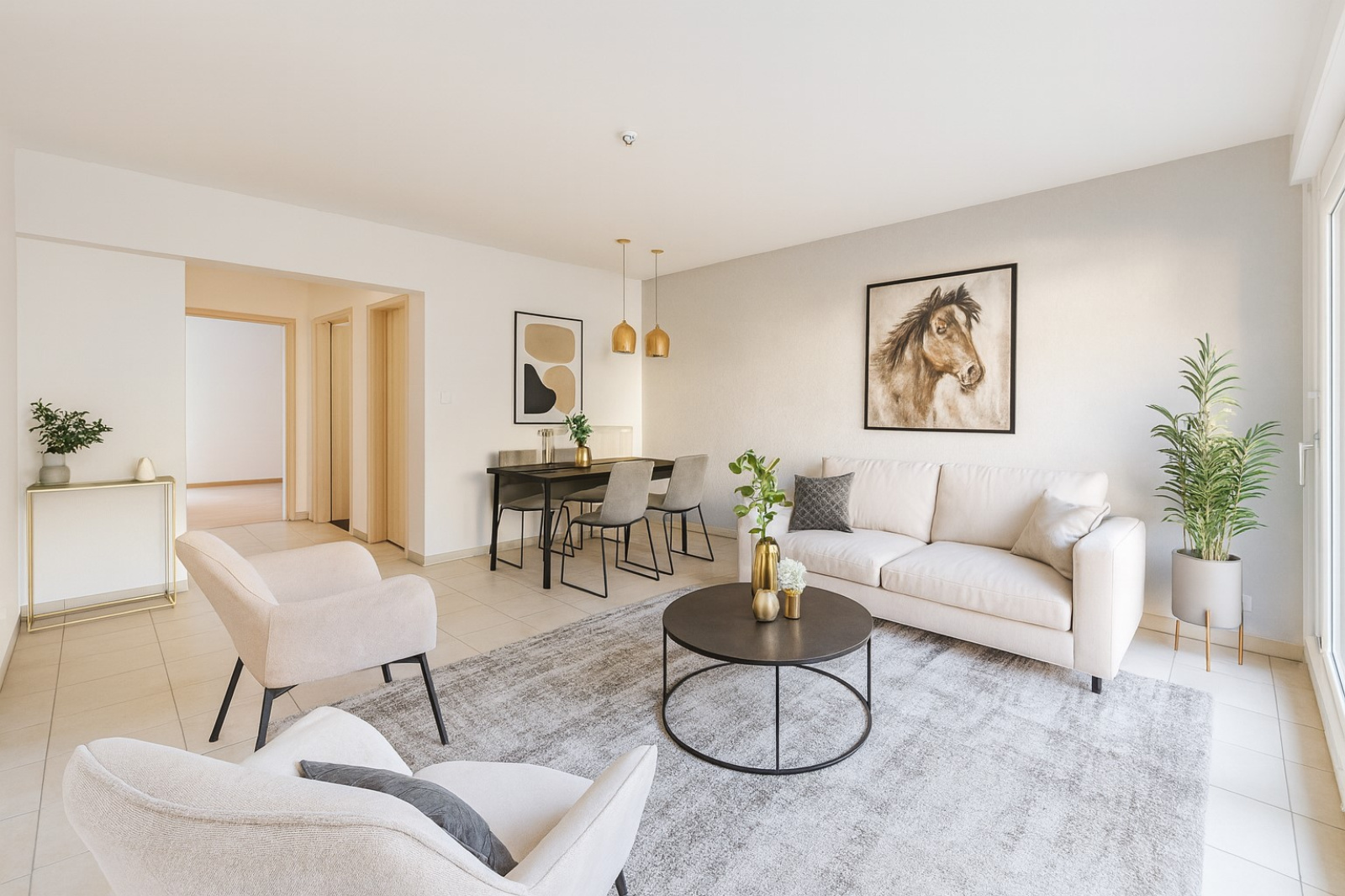 Au premier étage avec ascenseur du bâtiment, le logement de 68 m² se compose d'une entrée, d'une belle pièce à vivre, d'un espace cuisine, d'un dégagement, de deux chambres, d'une salle de bains, d'un WC séparé et d'une terrasse exposée sud-ouest.