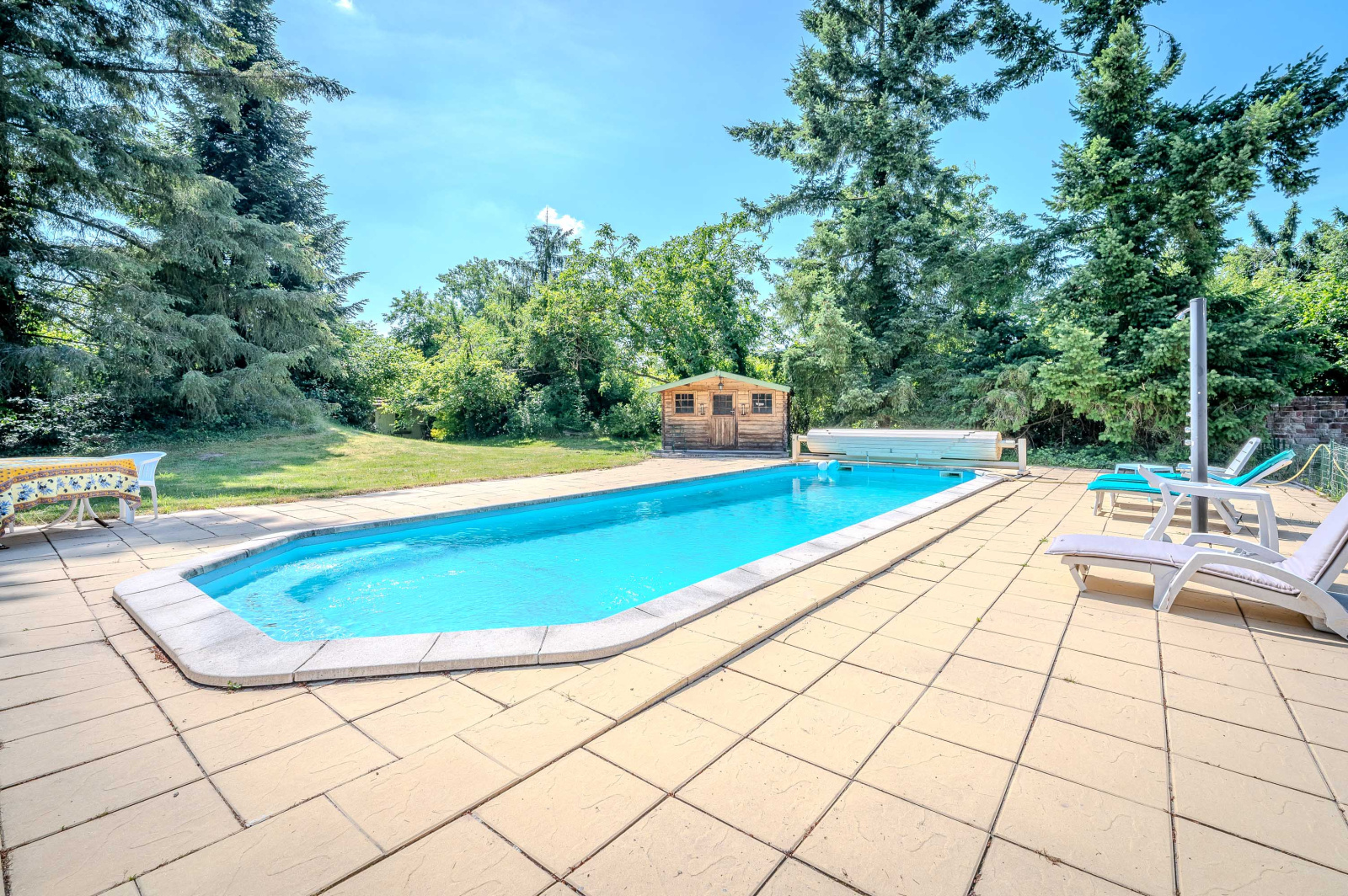 À l'extérieur : une grande cour, un espace piscine avec son chalet contenant la pompe à chaleur et de grands espaces verts contenant une annexe.